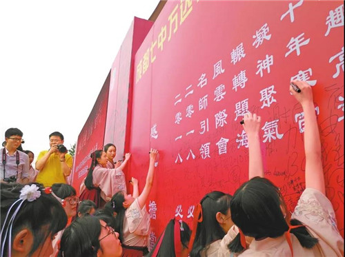 即将参加高考的学生在高考签名墙签名。图片来源:华西都市报